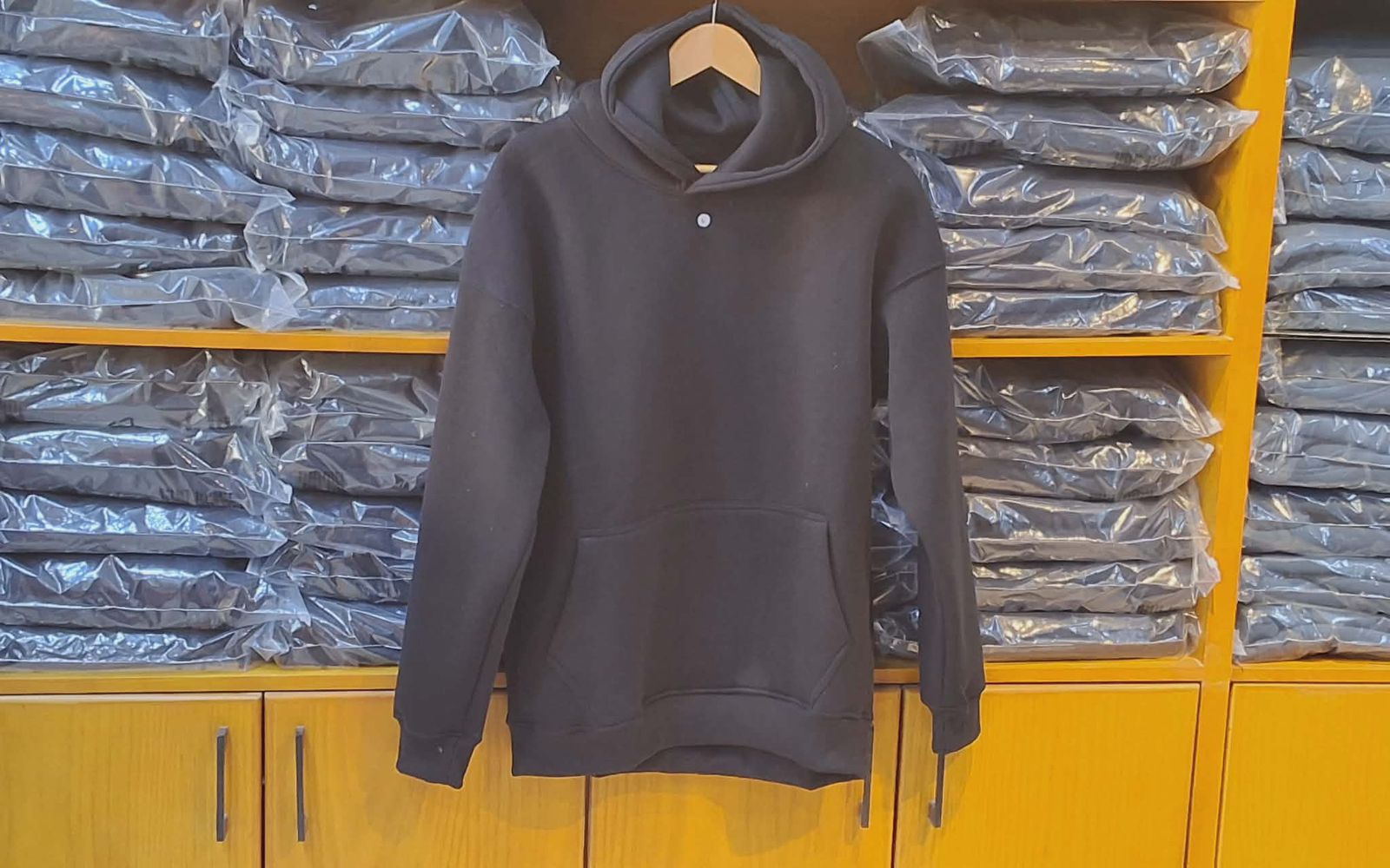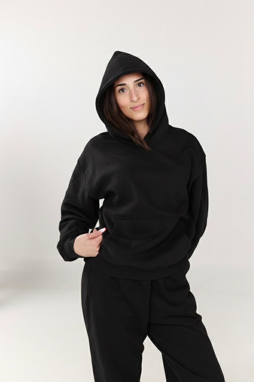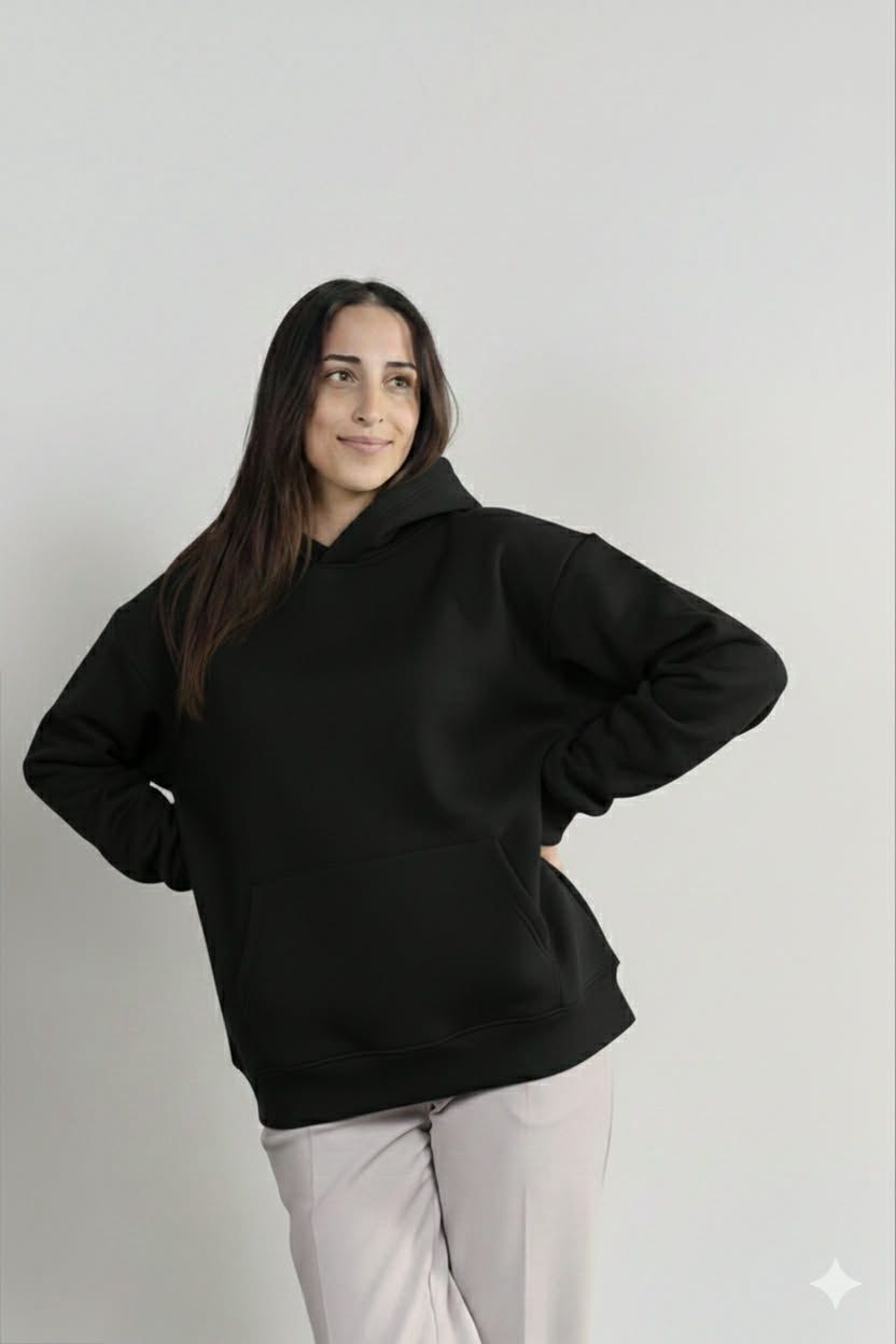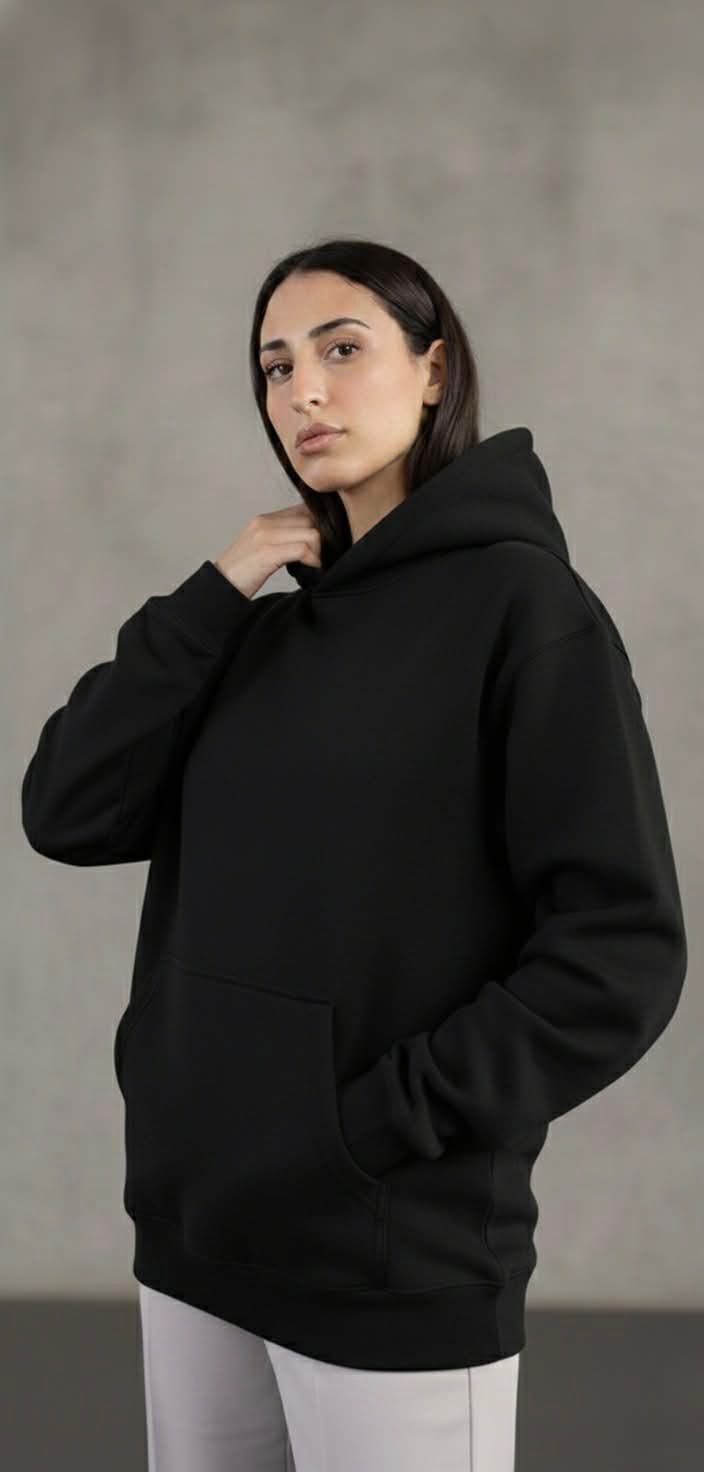 هودي أوفر سايز باللون الأسود، مصنوع من قطن ملتن إسفنجي ناعم، مريح في اللبس وعملي للاستخدام اليومي. معالج ضد الوبر والانكماش للحفاظ على الجودة والشكل.